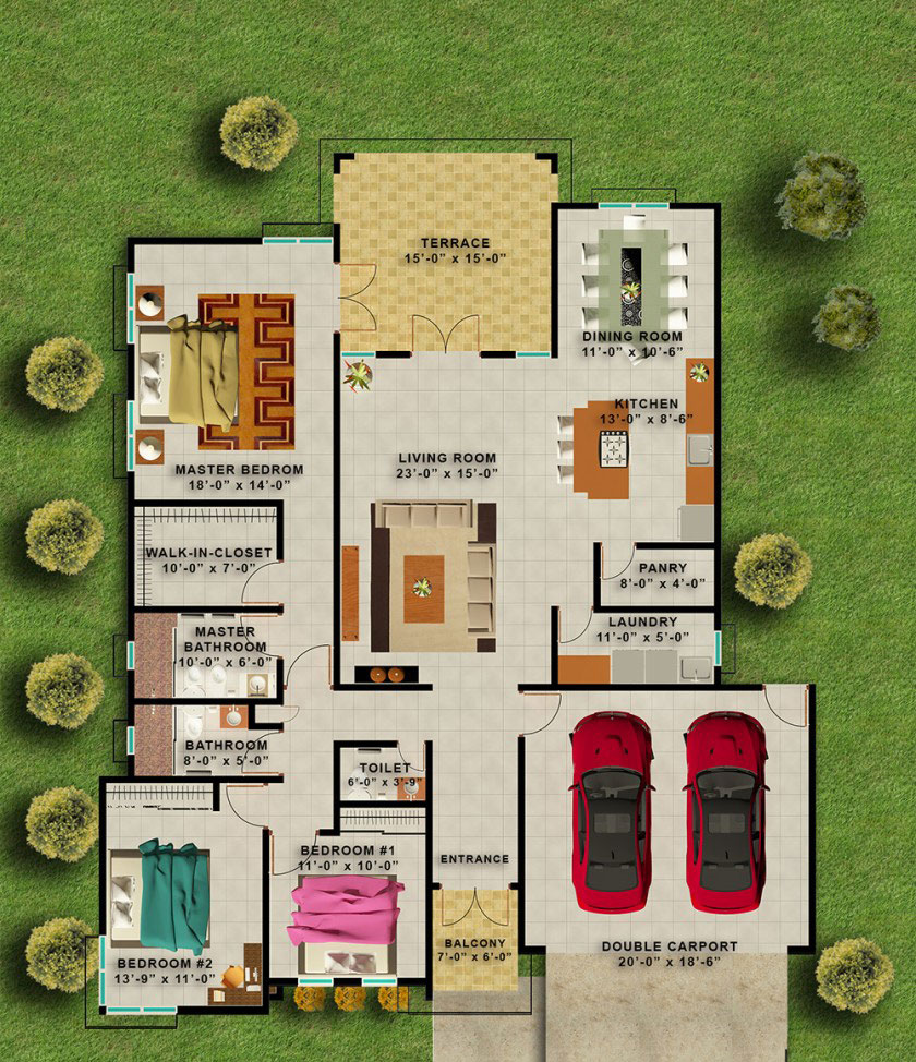 La zona privada responde al mismo estándar de generosidad. La suite principal —de 18′ × 14′, una de las más amplias de su categoría— se presenta como un verdadero retiro personal, con walk-in closet de grandes dimensiones y baño principal privado. Los dos dormitorios secundarios, ubicados en el ala opuesta para garantizar privacidad, comparten un baño completo, mientras que un medio baño independiente sirve al área social, evitando el cruce entre visitas y zona íntima. Se complementa con un carport doble techado para dos vehículos y un balcón de recibo en la entrada, que añade un gesto de bienvenida memorable al acceso principal.